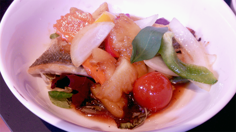 Tina’s gin-cured sea trout featured luxuriously, velvety pink fish – massively superior in taste and texture to farmed salmon – subtly enhanced with the flavour of gin-infused botanicals. Yet, pleasant as the accompanying raw salad of shallot, fennel and orange was it just lacked the necessary punch to counterpoint the richness of the sea trout, even with the addition of chive crème fraiche dressing.